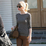 Taylor Swift left her LA home with new beau Harry Styles looking preppy chic as usual in a black-and-white striped top and these Burberry bag. Signature red lips added much-needed color to her casual daytime ensemble. Mimic Taylor's latest look by pairing a striped top with her exact jeans - on sale! - then finishing off with boyish oxfords, retro shades, and punchy lips.